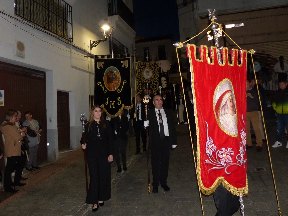 La organización del cortejo ha dispuesto en su cabeza la cruz guía de la cofradía que deja ver en su cruceta el escudo corporativo con la lanza sagrada del Longinos y las escaleras que han de servir para bajar el cuerpo de Cristo de la cruz, insignia que es obra del escultor granadino Antonio Díaz Fernández. La cruz guía va flanqueada por dos faroles de frente de procesión, tras los que se han dispuesto dos largas filas de fieles devotos portando velas en sus manos. Tras ellas, las corporaciones penitenciales y de gloria han ocupado el lugar que le corresponde en sus respectivas salidas procesionales. Así pues, figura a su cabeza la cofradía del Cristo de la Humillación, seguida de la de Jesús Nazareno y Nuestra Señora de la Esperanza, San Juan Evangelista, María Santísima de las Penas, Santo Entierro, Nuestra Señora de los Dolores, la asociación parroquial de San Antonio de Lobres, que porta en esta ocasión el estandarte del Santo Entierro, y la hermandad patronal de Nuestra Señora del Rosario. Precede ésta al al estandarte de la cofradía del Santisimo Cristo del Perdón, que va flanqueado por una representación de la cofradía que componen Dª Dolores Mochon Martín y Dª Carmen González Palomino. Siguen en presidencia oficial los hermanos cofrades D. Antonio Vacas Espinosa, D. Jose Luis Arnedo Villaescusa y D. Miguel Vidoy Benavides. A continuación, el libro de reglas corporativo y la representación institucional que ostenta el hermano mayor, D. Francisco Villaescusa Moreno, junto a D. Julio Espin Gómez, vice-hermano mayor, la concejala de economía y hacienda, Dª Mari Carmen Rodriguez Callejón, y la de cultura, Dª María Isabel Ruiz Aguilar. Seguidamente, el cuerpo de acólitos que ha dado paso al trono del Santísimo Cristo del Perdón. La impresionante imagen titular es de indudable traza barroca y de autor desconocido, pudiendo encuadrarse su hechura en los comienzos del siglo XVII. En tiempos de la II República, la efigie presidía el altar mayor de la iglesia y, en la guerra civil, fue desmantelada perdiendo los dos brazos y la cruz, por lo que en los primeros tiempos de posguerra tuvo que ser restaurada y repuesta al culto.