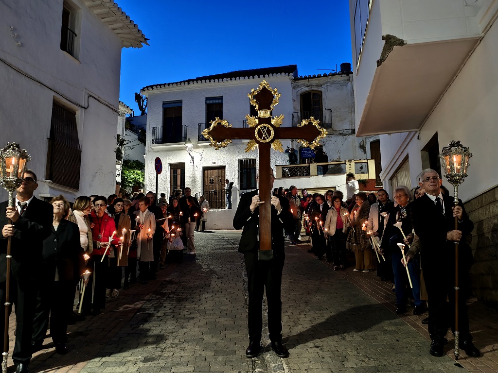 En el mismo lugar, EL FARO ha tenido la oportunidad de entrevistar al hermano mayor de la cofradía, D. Francisco Villaescusa Moreno, quien mostraba su satisfacción personal de como había transcurrido todo, refiriendo que “desde luego, ha sido una fervorosa manifestación de fe que ha secundado el pueblo de forma masiva y espontánea ya desde sus primeros momentos”. Igualmente, destacaba la gran afluencia de fieles a la santa misa, donde el pueblo ha abarrotado por completo todo su espacio, así como también la presencia del cuerpo de hermanos portadores, donde se han integrado numerosos jóvenes que han seguido igualmente la santa misa con mucho respeto. A nivel personal, Francisco Villaescusa ha querido resaltar un momento muy especial, el del acompañamiento de la banda de música por ser la primera vez ya que se trata de una procesión silente. De la misma forma ha señalado que tanto a su salida como a la entrada en la iglesia se ha encendido una traca de cohetes, novedad que impone, sin duda, “sensaciones muy distintas de nuestra salida penitencial, siempre en silencio, de ahí que en todos los presentes se hayan despertado sensaciones de sonidos e imagenes muy distintas de lo tradicional y que han hecho mucha ilusión al cuerpo de portadores y a la propia cofradía”.