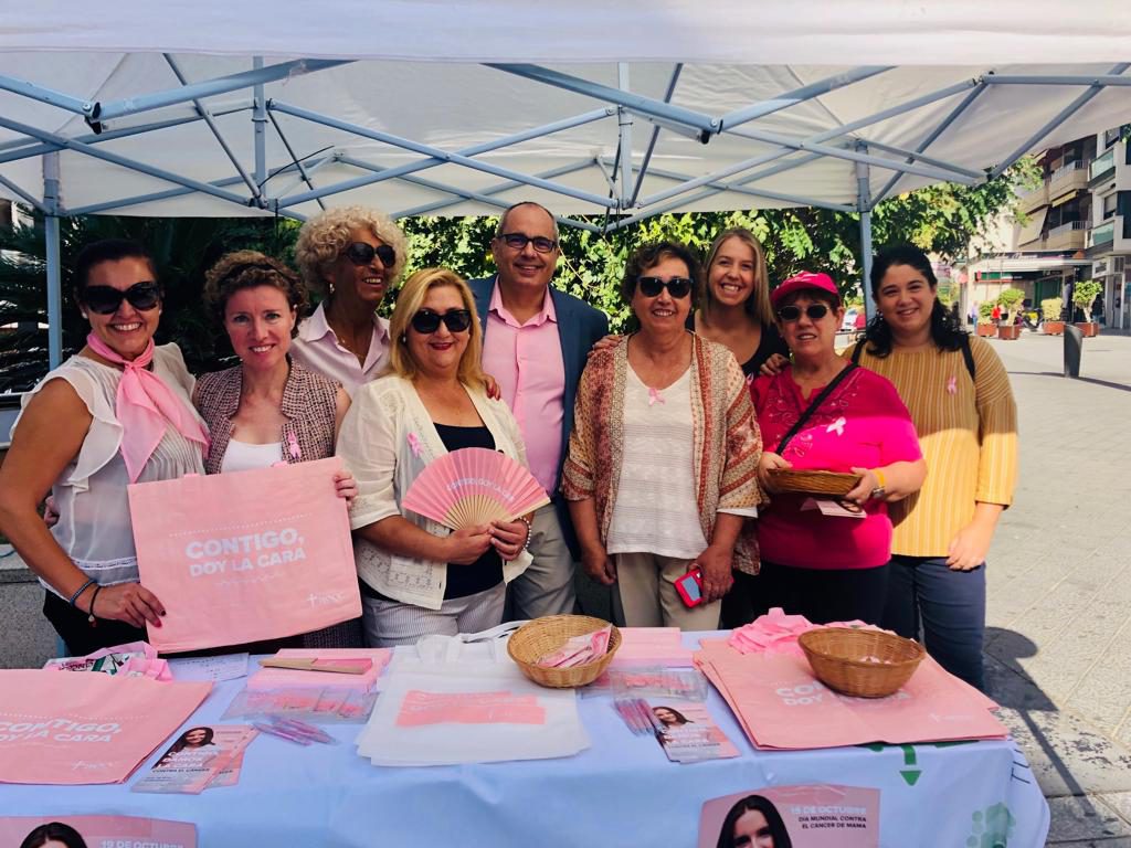 El portavoz de Andalucía Por Sí en el Ayuntamiento, David Martín, junto a integrantes de su formación política ha asistido a la mesa informativa instalada por la Asociación Española Contra el Cáncer durante la mañana del viernes en la plaza de la Aurora de Motril con motivo del Día Mundial Contra el Cáncer de Mama.