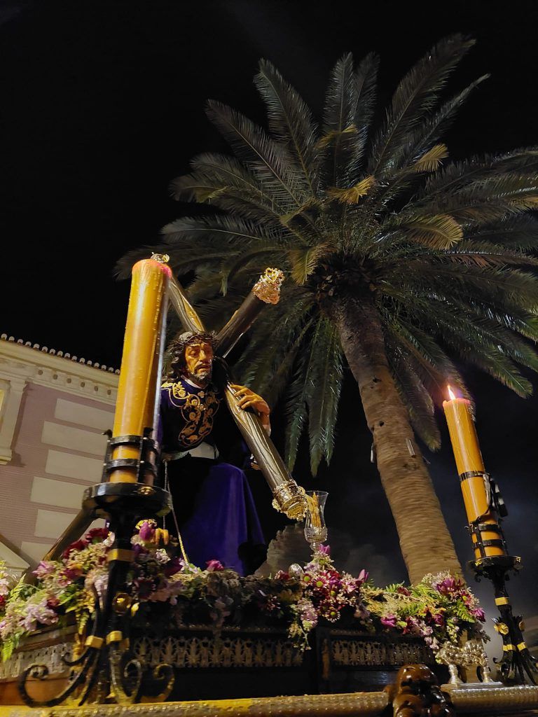 Tras la cruz parroquial se han dispuesto dos largas filas de hermanos de luz de la propia hermandad que iluminan el paso a su sagrado titular. Seguidamente, se han incorporado a la comitiva y en perfecta formación miembros del cuerpo Nacional de Policía en traje de gala. Tras ellos, ha marchado el trio de música de cámara de la asociación “Granamusic”, que todos los años figura como invitada al cortejo y que ha interpretado una selecta representación de marchas procesionales. A continuación, ha ocupado su lugar el cuerpo de acólitos que precede a las andas de Jesús de Pasión, que han sido portadas al hombro por su propio cuerpo de hermanos costaleros y dirigidas por su capataz, Pablo Alberto Rincón Correa. La imagen figura sobre un artístico adorno de claveles de color rojo, que la hermandad ha querido disponer a modo de guiño a la primera salida penitencial tras su llegada a Motril. Tras las andas, ha marchado la representación eclesiástica que componen los sacerdotes oficiantes en unión del párroco del Santuario de Nuestra Señora de la Cabeza, D. Hermes Moreno Arias, juntamente con la propia de la ciudad y representantes del cuerpo de la Policía Nacional, a los que ha seguido una inmensa multitud de fieles.