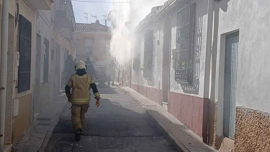 Justo cuando han llegado efectivos de Bomberos y Policía Local de Motril, un hombre que habitaba la vivienda, se ha precipitado desde una altura de un segundo piso -azotea-, seguramente preso del pánico ante el incendio que consumía su casa, cayendo en parte sobre el hombro de un bombero.