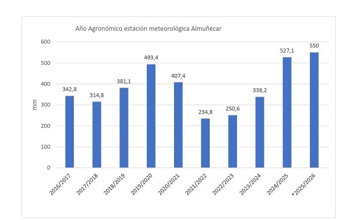 El concejal de Agricultura del ayuntamiento de Almuñécar e ingeniero agrónomo, Carlos Ferrón, ha informado de que, según los datos recogidos de la estación agroclimática de la depuradora de Río Verde, del 1 de enero al 8 de febrero de 2026, la lluvia caída en Almuñécar ha superado los 350 litros, “más de lo que llovió en 6 de los últimos 10 años”.
