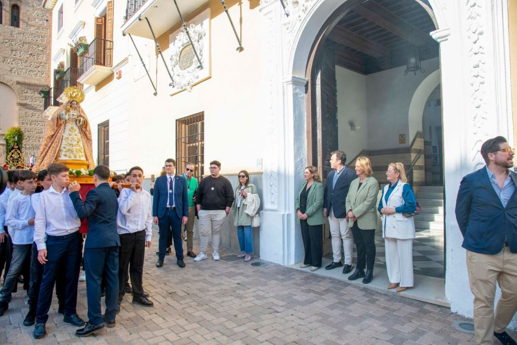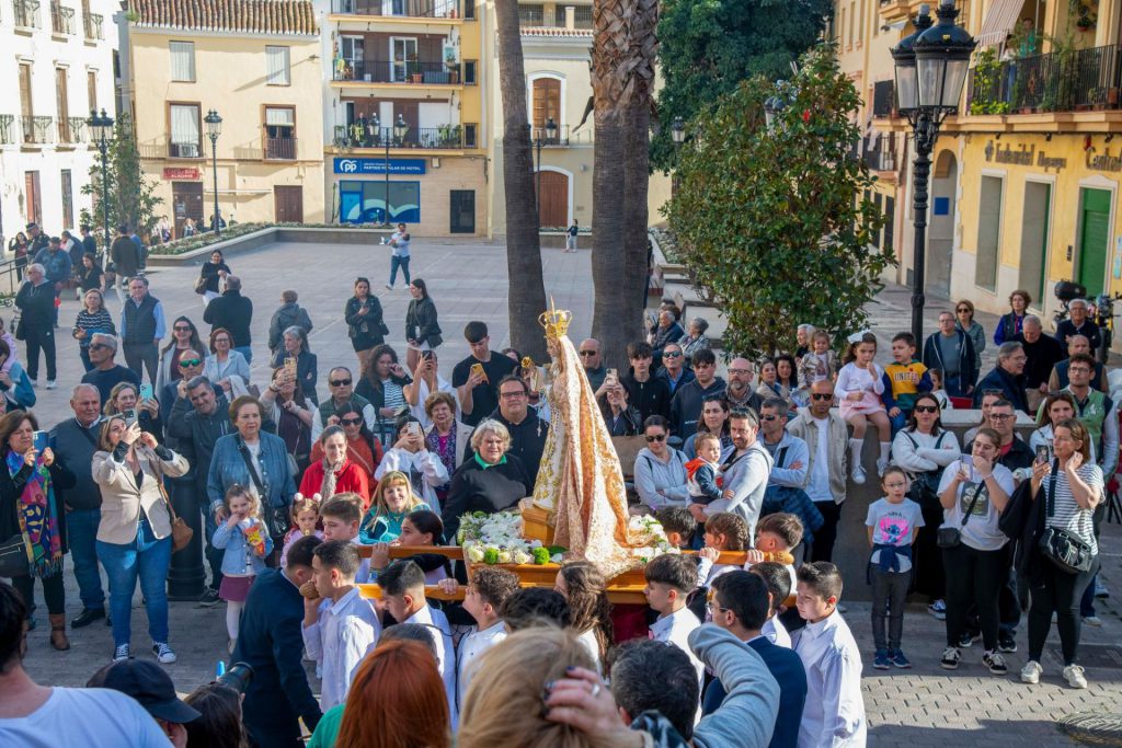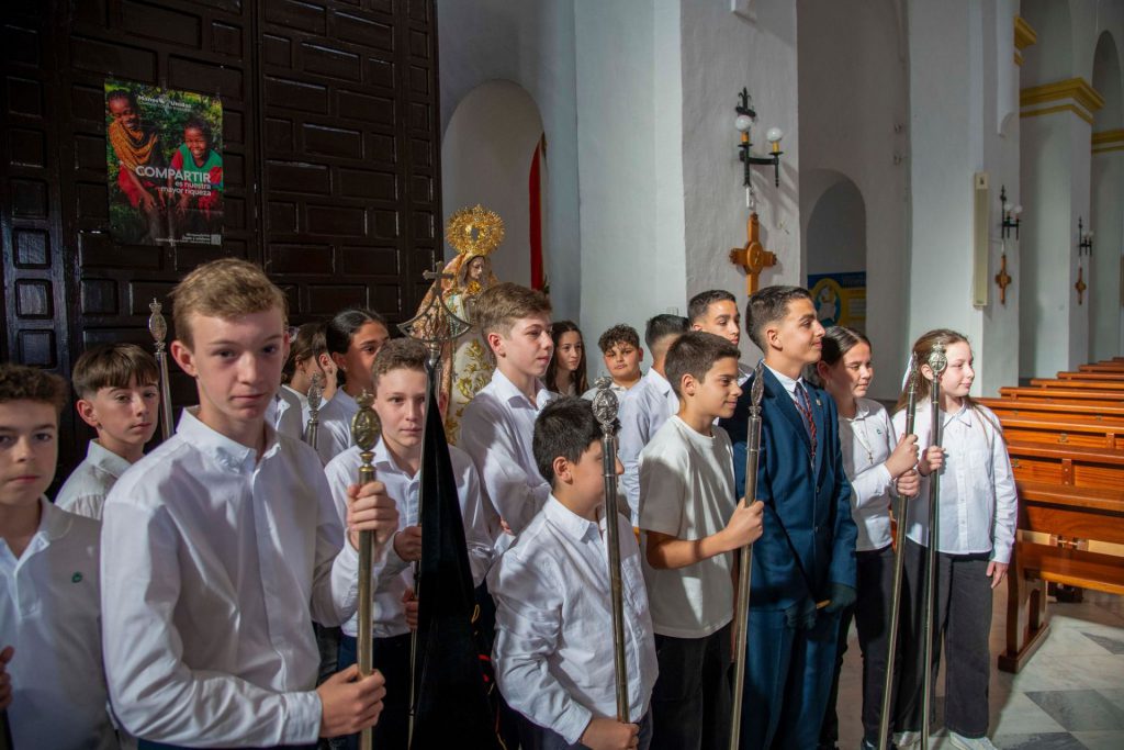 Iniciada la salida, ha abierto la cabeza de la procesión la cruz parroquial y ciriales, a la que han seguido las representaciones de los respectivos grupos jóvenes con sus estandartes y varas presidenciales. Concretamente, este año, han participado las hermandades juveniles de Pasión, Gran Poder, Humildad y Victoria, Angustias, Virgen del Carmen, Divina Pastora y Virgen de la Cabeza. Seguidamente, se disponía el cuerpo de ciriales e incensarios, que daba paso a las andas de María Santísima de la Caridad, que marcha portada al hombro por una cuadrilla de jóvenes hermanos. La imagen de la Virgen es obra del escultor veleño Israel Cornejo Sánchez, que la pudo entregar a la cofradía en los primeros días del mes de marzo de 2024. En este año la Virgen de la Caridad ha sido aderezada en su vestimenta por el hermano Abraham Ortega, portando para la ocasión una saya que ha cedido el conocido cofrade Carlos Gustavo Fernández Páramo, además de un manto bordado que ha sido donado por varios hermanos. Finalmente, ha cerrado la marcha la Agrupación Musical Nuestra Señora del Carmen de Calahonda.