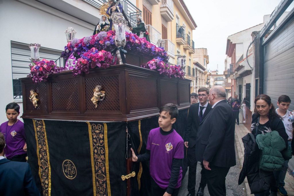 El pequeño paso de misterio ha sido portado por veinte costaleros, quedando a cargo de su capataz, Carmen López Rodríguez, que ha tenido como asistentes a la joven Jimena Fernández y Santiago Rodríguez Marcos. Además, todo su trabajo ha sido supervisado en todo momento por Francisco López Morales, “Paquito”, capataz del paso de misterio del miércoles santo. Por lo que respecta al exorno floral, ha sido realizado por “Casa Floral Palmira”. Finalmente, ha cerrado el cortejo la Sección Musical del Santísimo Cristo de la Resurrección de Granada que ha marcado con sus sones el paso de la cuadrilla de costaleros. Bajo esta disposición y sin ningún tipo de interferencia climatológica se ha podido concluir el itinerario marcado, si bien, el retraso de una hora causado por la lluvia ha motivado que el cortejo haya marchado a un ritmo más acelerado para efectuar así el encierro a la hora fijada, las 20:30 hrs de la tarde.
