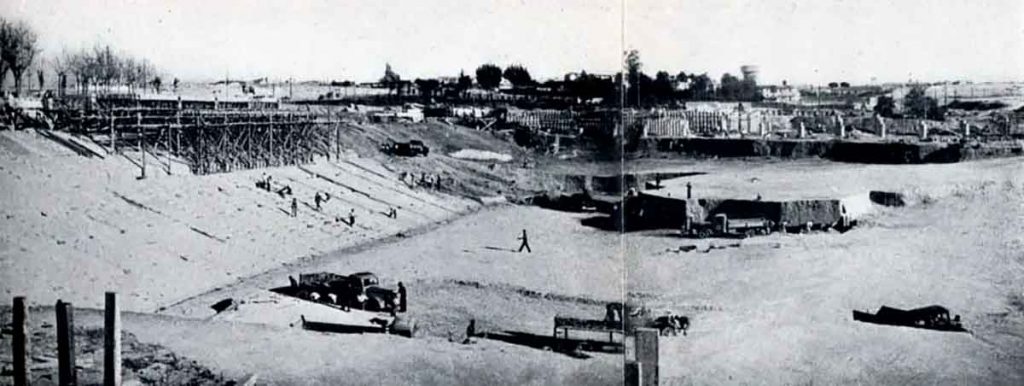 Fernando de Cárcer Disdier (1891 – 1968), Teniente Coronel de Infantería, ayudante del General Muñoz Grandes en la División Azul y vicepresidente primero del Real Madrid C.F. afirmaba sobre el desarrollo de las obras durante el año de 1947 que: “Encontramos numerosas dificultades para el transporte de materiales. Tenga en cuenta que se han utilizado 18.000 m2 de gravas, 24.000 m2 de arena, 2.000.000 de ladrillos, 900 m2 de madera y se han movido unos 150.000 m3 de tierra. Para ello ha habido que cargar 82.000 camiones de 4 toneladas… Por término medio han trabajado al día 150 obreros, por lo que ha habido que pagar unos 315.000 jornales. Para los servicios y red sanitaria se han instalado 4 kilómetros y medio de tubería de gres, hierro y plomo, con 90 lavabos de porcelana, 125 inodoros, 365 urinarios y 46 duchas. (Se han construido los siguientes Servicios): 4 vestuarios para jugadores con sus correspondientes duchas, piscina, sala de masaje y botiquín. Una enfermería con 6 camas, cuarto de cura y quirófano de urgencia. Un vestuario para el árbitro con todos sus servicios. Un cuarto ropero con taller de repaso de ropa y plancha. Zapatería, lavadero y un amplio gimnasio. Central telefónica y central amplificadora de radio… además se ha construido un cuarto para detenidos evitando de este modo que, llegado el caso, la fuerza pública distraiga sus servicios en la conducción de los mismos (…). Esto es un gran éxito para el Real Madrid y el pueblo madrileño”.