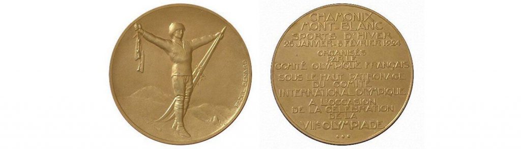 Las Medallas: Son diseñadas por Raoul Bernard (1881- 1961) y fabricadas en la Casa de la Moneda Francesa. Tienen de diámetro: 55 mm. Grosor: 4 mm. Peso: 75 gr. Material: en plata dorada la del primer puesto y plata y bronce las del 2º y 3º clasificado. En el anverso aparece un deportista con los brazos en alto, portando en su mano derecha unos patines y en la izquierda un par de esquís. El reverso tiene la siguiente inscripción: «CHAMONIX MONT-BLANC SPORTS D’HIVER 25 JANVIER – 5 FEVRIER 1924 ORGANIZES PAR LE COMITÉ OLYMPIQUE FRANÇAIS SOUS LE HAUT PATRONAGE DU COMITE INTERNATIONAL OLYMPIQUE A L’OCCASION DE LA CELEBRATION DE LA VILLE”.