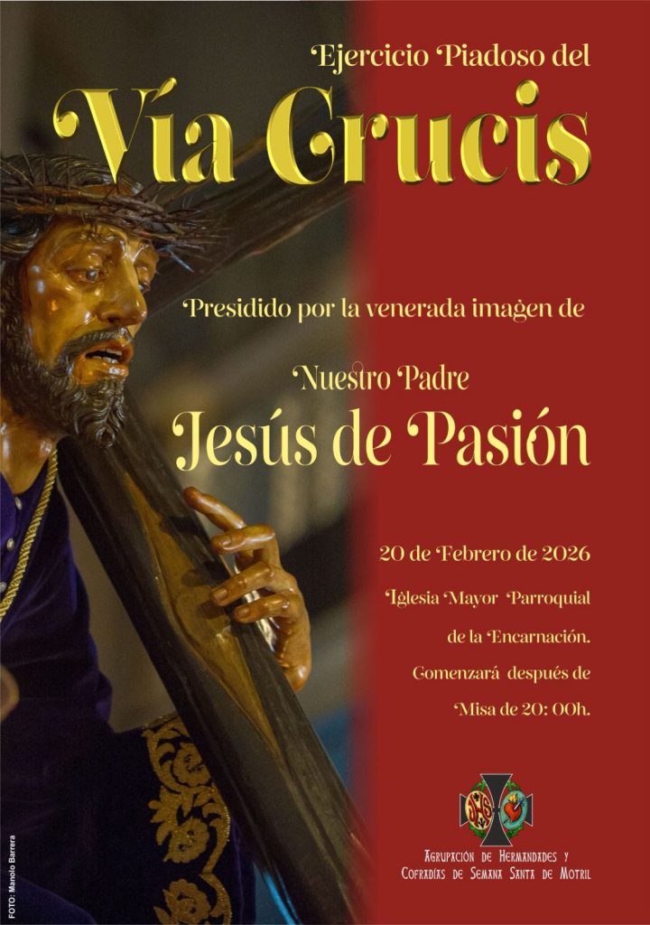 La Agrupación de Hermandades y Cofradías de la Semana Santa de Motril organizada el tradicional Vía Crucis, el próximo viernes 20 de febrero desde la Iglesia Mayor Parroquial de la Encarnación, tras la misa de las ocho de la tarde.