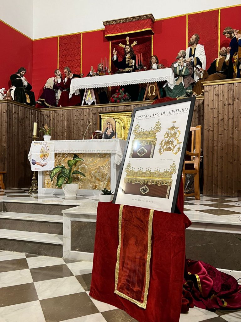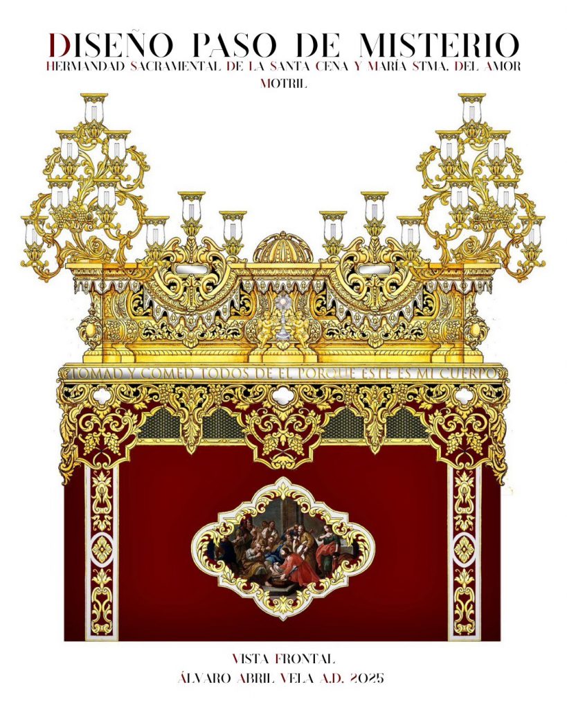 Según exponía Álvaro Abril en su informe, “Este paso no es simplemente una obra de arte; es una manifestación viva de fe, luz y devoción, donde cada detalle, cada reflejo y cada símbolo dialogan con la tradición y el espíritu de nuestra hermandad. Cada línea, cada curva y cada destello de luz nos recuerdan la grandeza de los días más gloriosos del calendario litúrgico, invitándonos a contemplar y a vivir la pasión el sacrifico y el amor de Cristo como comunidad. En sus esquinas flanquean cuatro candelabros arbóreos de los que arrancaran siete luces cada uno, desde cuernos de la abundancia cuajados de uvas, a espigas y frutos tropicales, en alusión a la sacramentalidad y a la propia ciudad de Motril. Además, encima de cada cartela se ubican tres tulipas, sumando cinco puntos de luz a cada lateral y dos en el frontal y trasera, lo que hace un total de setenta puntos de luz repartidos por todo el conjunto. Como parte principal, podemos observar un poderoso canasto, con forma tronco piramidal truncado y planta rectangular con entrantes y salientes propios del barroco granadino. Junto a ello, una gran cornisa circunda todo el paso, de la que descienden los paños y se disponen las cartelas centradas por espejos, conteniendo los nombres de cada apóstol según su ubicación en el misterio. En el frontal aparecerán las palabras “panus” y “vinus”, integradas a su vez en la crestería coronada por tulipas. De esta cornisa se desprenden, a modo de bambalina, curvas y contra curvas que contienen espejos, generando juegos cromáticos originales según la luz y el sombreado de su forma. El programa iconográfico del paso incluye un gran número de uvas y espigas repartidas por el canasto, junto a motivos de la talla barroca granadina de gran volumen y elegancia. Destacan, igualmente, las representaciones a modo de sagrario, coronadas por cúpulas que albergan la custodia sostenida por ángeles en el frontal y un pelícano en la trasera, en alusión al Amor y a la sacramentalidad. Asimismo, en el baguetón, distribuido en cuatro frases sobre base de espejo aparece la cita que Jesús dijo en su última Cena: Tomad y comed todos de él porqué este es mi cuerpo. Tomad y bebed todos de él porque este es el cáliz. Sangre de la alianza nueva y eterna que será derramada para el perdón de los pecados. Que será entregado por vosotros, haced esto en conmemoración mía. Por lo que respecta al respiradero, se divide en dos zonas diferenciadas: una superior pegada al baguetón, tallada y dorada, y otra inferior con bordados barrocos sobre terciopelo rojo y zonas de malla que permiten la ventilación, ambas con motivos ornamentales y eucarísticos”.