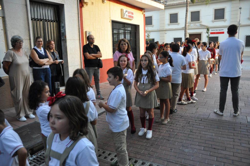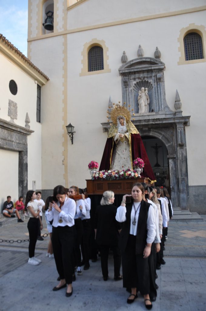 Con puntualidad, la comitiva ha salido a la calle abriendo su paso la cruz parroquial y dos ciriales, a los que ha seguido la banderola del Grupo Joven de la cofradía, tras la que se han dispuesto en dos filas los jóvenes alumnos del colegio de San Agustín provistos de su uniforme oficial. A continuación, ha presidido el centro de las filas la “bacalá” corporativa de la cofradía, a la que han seguido como hermanas de luz representantes del cuerpo de camareras de la Virgen y numerosos fieles. Seguidamente, se ha situado el prior de la comunidad, Padre Antonio Martín Blanco, junto a una amplia representación de novicios procedentes del Convento de Nuestra Señora del Buen Consejo de Monachil con el hábito agustino. Tras ellos se ha situado la presidencia oficial que ostenta Juan Carlos López Rodríguez en su calidad de anterior hermano mayor de la hermandad, que ha estado acompañado por el Padre Fortunato Pablo Urcey (OAR), obispo que fue de Chota (Perú), y los representantes del cuerpo directivo del colegio de San Agustín. Tras ellos, el trío de la capilla musical que ha interpretado música de cámara, al que ha seguido el cuerpo de acólitos que dan paso a las andas de Nuestra Señora del Mayor Consuelo. Dirige las mismas, en labores de capataza, la hermana mayor de la cofradía, Yolanda Rodríguez Maldonado.