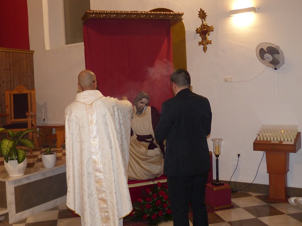 Finalizada la homilía, y según el rito de la bendición, el párroco ha procedido a incensar la imagen del santo y asperger el agua bendita sobre él, procediéndose a continuación al encendido de las velas del altar portátil en el que se encuentra Santo Tomás y que significan la luz del mundo.