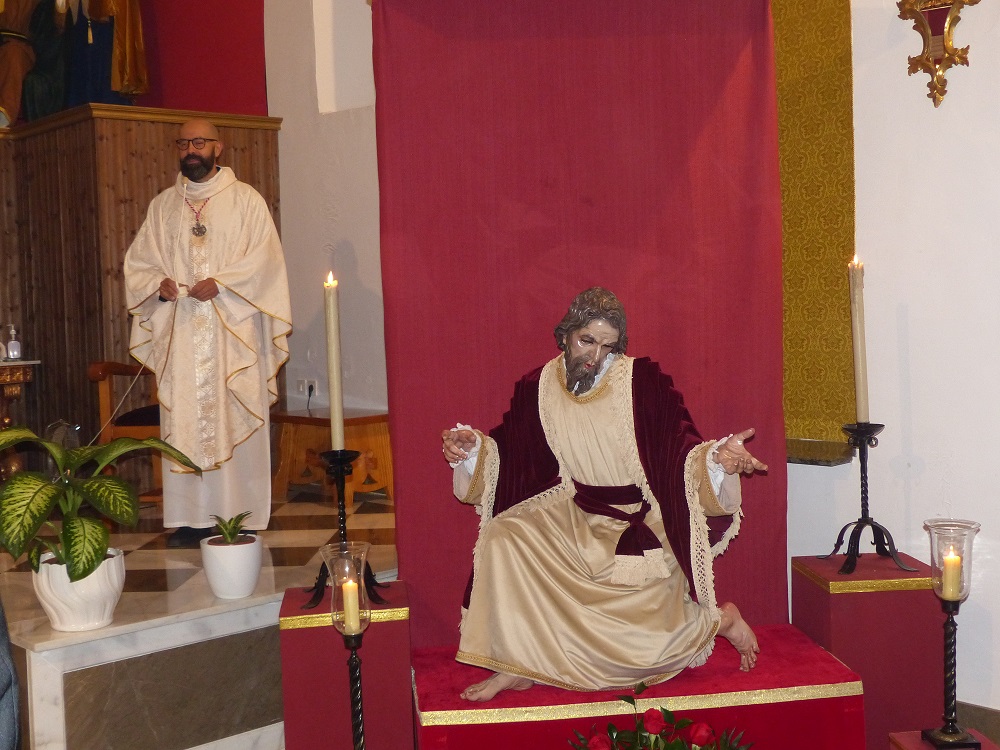 En la tarde del sábado, 22 de noviembre, la parroquia de San Antonio de Padua ha acogido la bendición de una nueva imagen del Apostolado de la Santa Cena, la de Santo Tomás, el apóstol que dudó, ceremonial que ha tenido lugar durante el transcurso de la santa misa del día que ha oficiado su párroco y consiliario, D. Hermes Moreno Arias. La eucaristía ha tenido lugar a las 18:30 h de la tarde en el día de la celebración de Cristo Rey, en la que el párroco ha felicitado a la hermandad por “el esfuerzo, la dedicación, el cariño y la oración de tanta gente que ha trabajado para que ya solo falten dos imágenes, los dos Judas”. Durante la celebración, la ermita se ha encontrado totalmente abarrotada de fieles, entre los que ha habido una gran participación de los hermanos en hermandad en las lecturas bíblicas y salmos responsoriales, así como los niños que realizan la catequesis en la iglesia, que han actuado de campanilleros que anuncian la consagración del pan y el vino como el cuerpo y sangre de Cristo.
